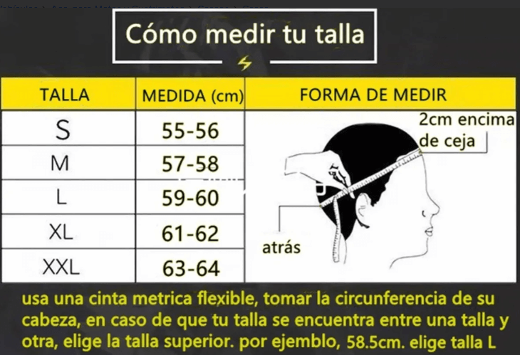 | Medida | XXL (63-64 cms), L (59-60 cms), M (57-58 cms), S (55-56 cms), XL (61-62 cms)  |